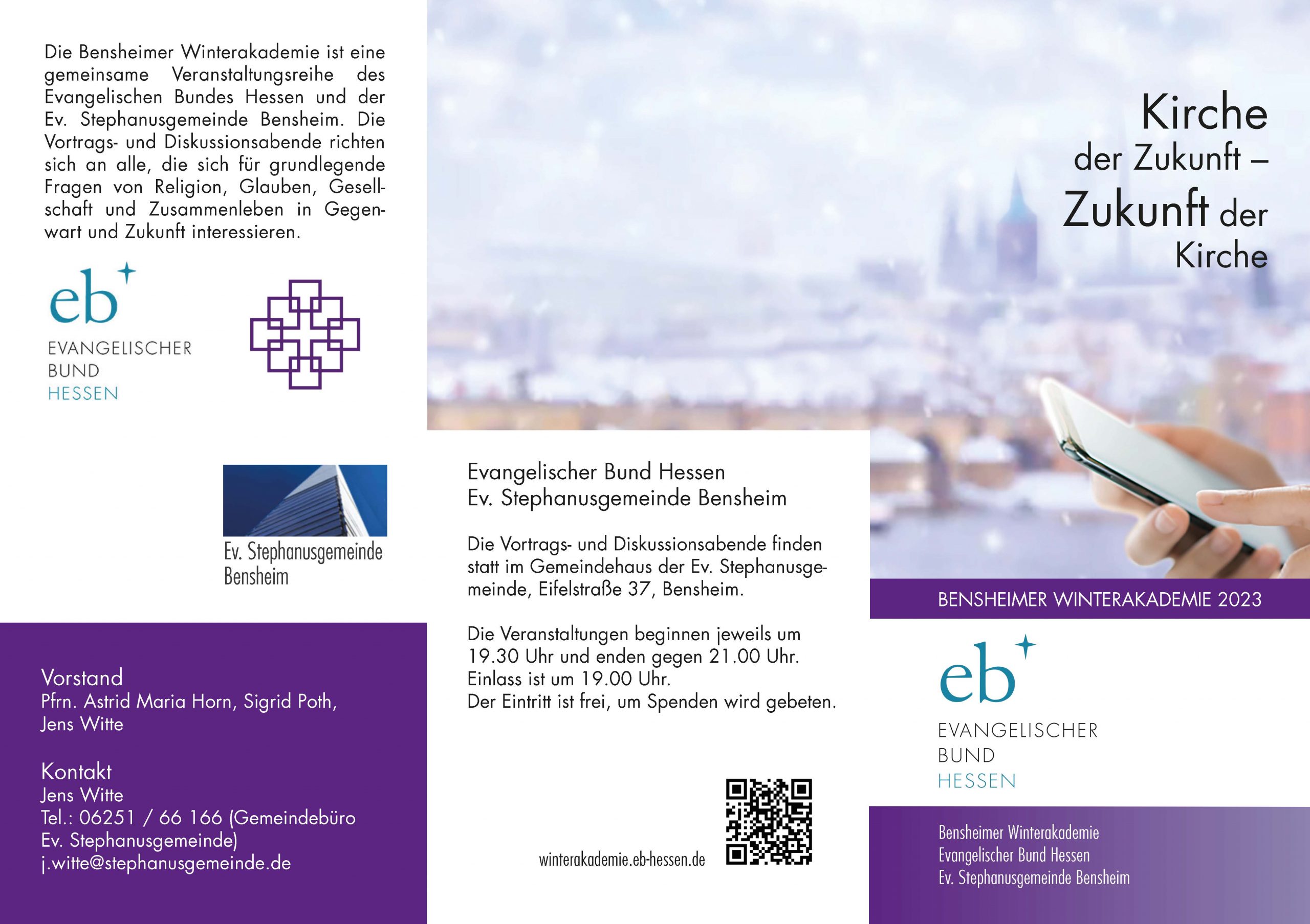 Die Bensheimer Winterakademie ist eine gemeinsame Veranstaltungsreihe des Evangelischen Bundes Hessen und der Ev. Stephanusgemeinde Bensheim. Die Vortrags- und Diskussionsabende richten sich an alle, die sich für grundlegende Fragen von Religion, Glauben, Gesellschaft und Zusammenleben in Gegenwart und Zukunft interessieren. |